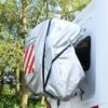 LET OP: de hoes wordt bevestigd aan één kant van de camper of caravan. Vervolgens plaats je je fietsen en sluit je de hoes netjes af, zodat deze volledig afgesloten is.